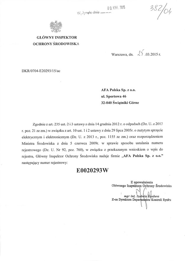 AFAPARK® stosuje i wspiera europejską dyrektywę RoHS, która ogranicza stosowanie niebezpiecznych substancji i wspiera ich przekształcenie poprzez WEEE (utylizacja odpadów elektrycznych i elektronicznych) z numerem rejestracyjnym, E0020293W przyznanym przez Polskie Ministerstwo Środowiska. Jesteśmy zaangażowani w aktywnym podejściu do ochrony środowiska.